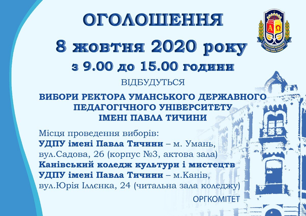 8 жовтня 2020 року з 9.00 до 15.00 години проходитимуть вибори ректора Уманського державного педагогічного університету імені Павла Тичини. Місця проведення виборів: УДПУ імені Павла Тичини – м. Умань, вул. Садова, 26 (корпус №3, актова зала); Канівський коледж культури і мистецтв УДПУ імені Павла Тичини – м. Канів, вул. Юрія Іллєнка, 24 (читальна зала коледжу).