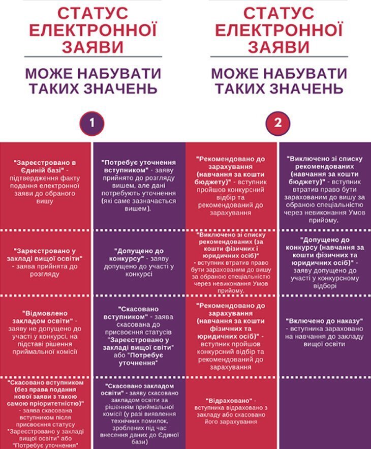 - «Відмовлено закладом освіти» (статус означає, що заяву не допущено до конкурсу на підставі рішення приймальної комісії).