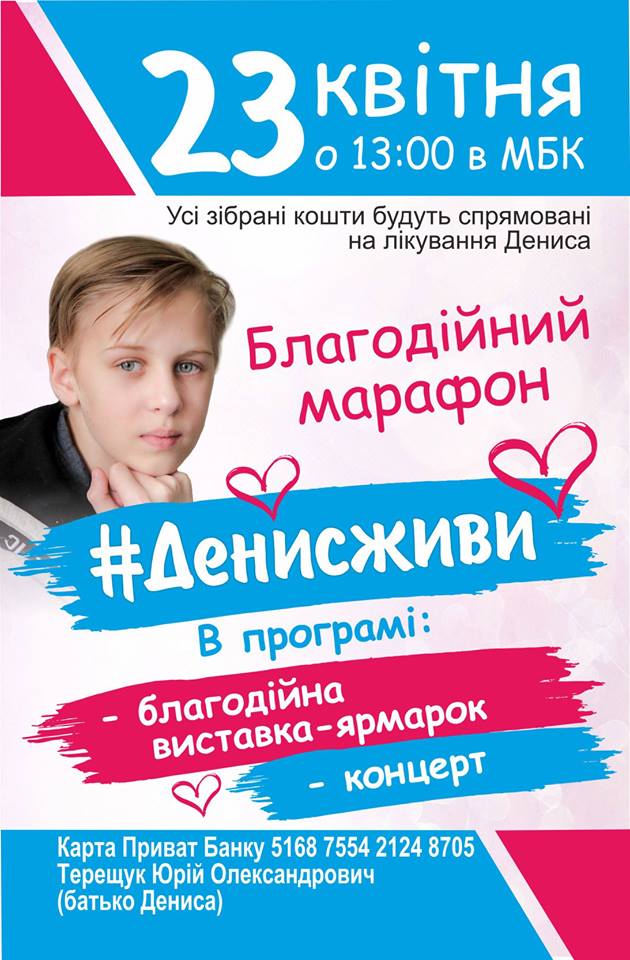 23 квітня 2019 року з 13.00 години в Уманському міському будинку культури проходитиме благодійний марафон #Денисживи. Запрошуємо взяти участь у виставці-ярмарку та долучитись до перегляду концерту на підтримку Дениса Терещука.