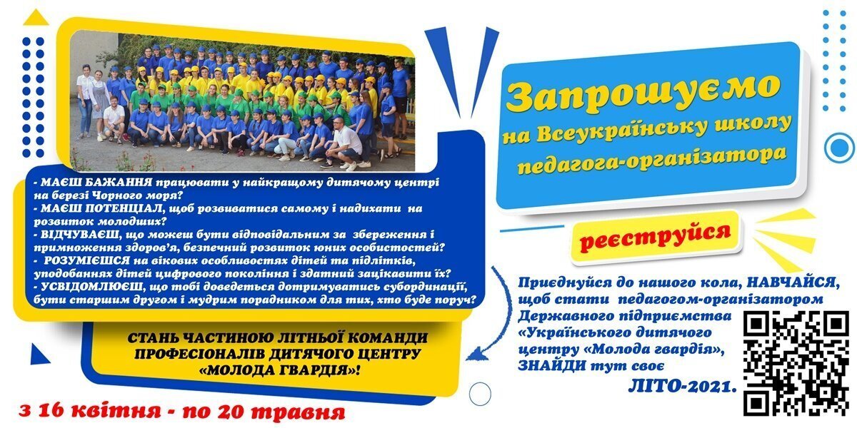 Якщо ви маєте бажання працювати у найкращому дитячому центрі на базі Чорного моря, активно і з користю провести літо-2021, тоді реєструйтеся на Всеукраїнську школу педагога-організатора та станьте частиною літньої команди професіоналів дитячого центру «Молода гвардія».