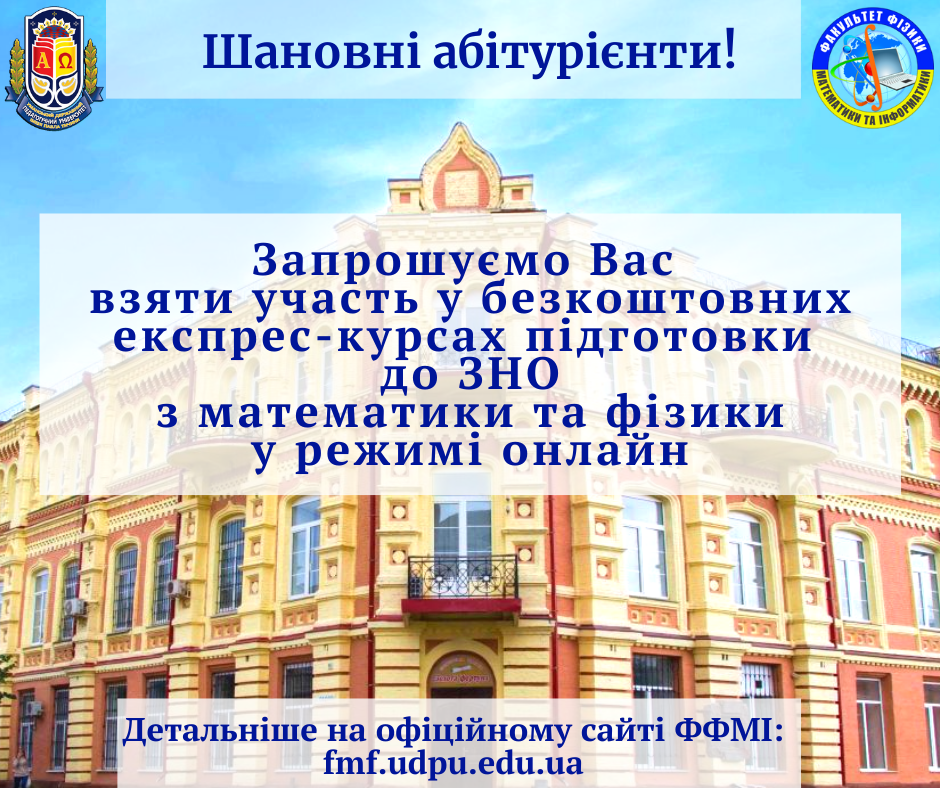 Факультет фізики, математики та інформатики Уманського державного педагогічного університету імені Павла Тичини запрошує на безкоштовні експрес-курси підготовки до зовнішнього незалежного оцінювання з математики та фізики в режимі онлайн.