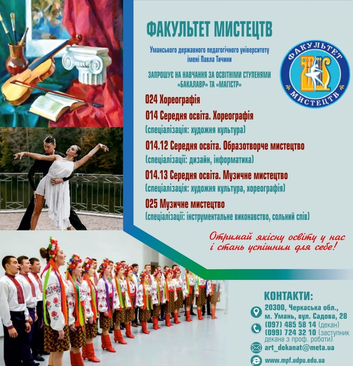 Факультет мистецтв Уманського державного педагогічного університету імені Павла Тичини – осередок вільної творчості, високого професіоналізму та майстерності. Поринути у неповторний світ хореографічного, музичного та образотворчого мистецтва, розвинути таланти і здібності може кожен, ставши студентом цього факультету.
