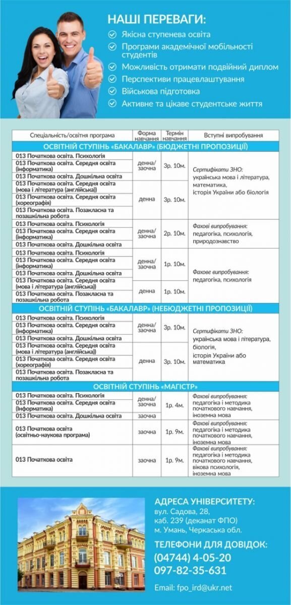 Адреса факультету початкової освіти: м. Умань, вул. Садова, 28 (новий корпус УДПУ).