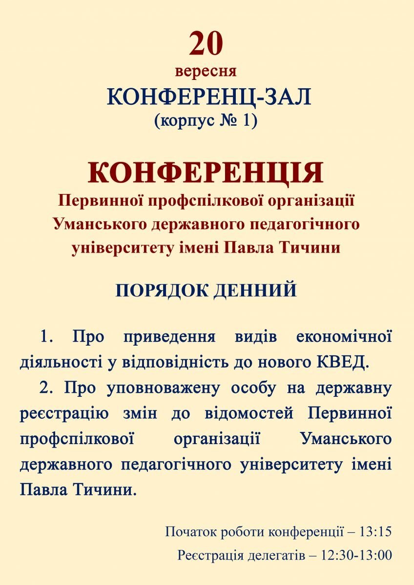 20 вересня 2022 року відбудеться конференція Первинної профспілкової організації Уманського державного педагогічного університету імені Павла Тичини: