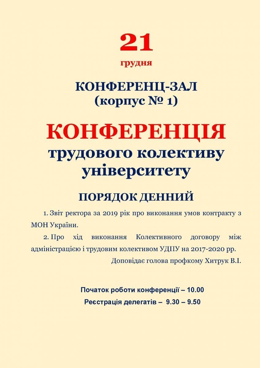 21 грудня 2019 року відбудеться конференція трудового колективу університету з порядком денним:
