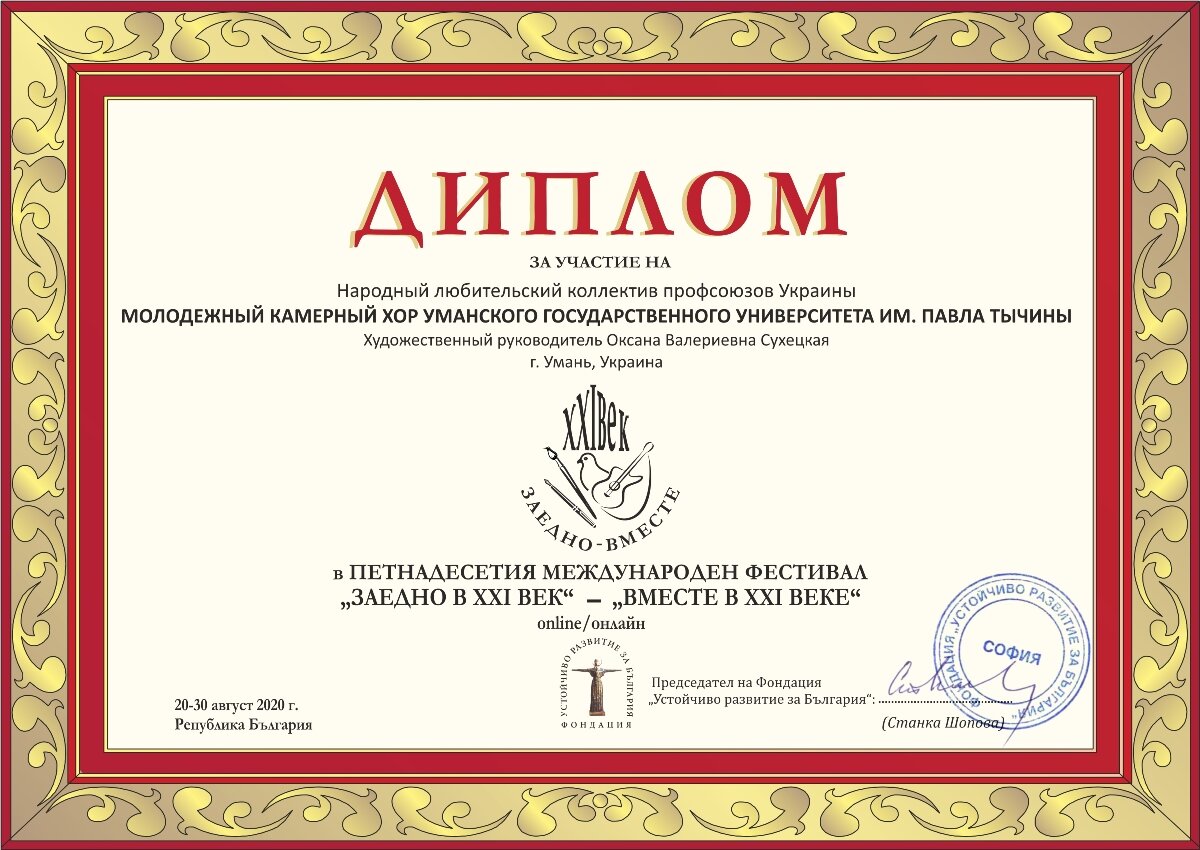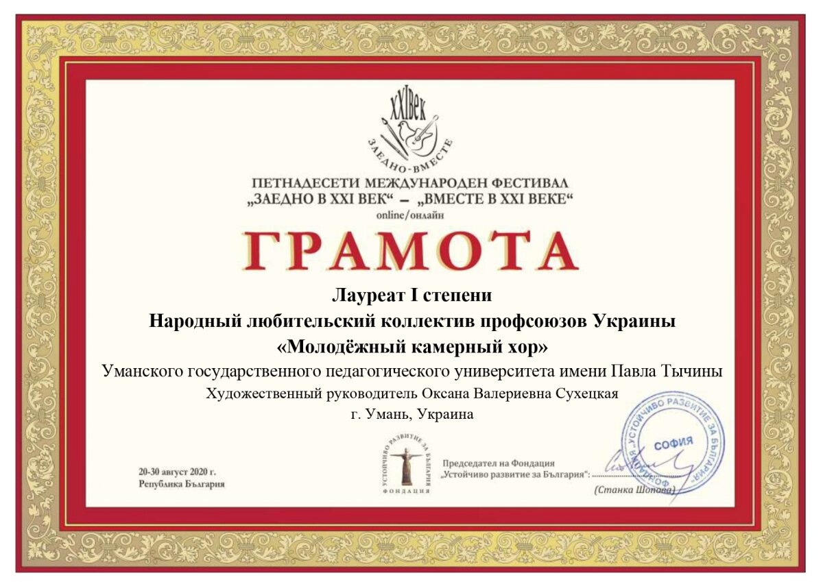 «Молодіжний камерний хор» УДПУ імені Павла Тичини (художній керівник та диригент Оксана Сухецька) став лауреатом І ступеня XV Міжнародної творчої зустрічі-фестивалю «ВМЕСТЕ В XXI ВЕКЕ» (Болгарія).