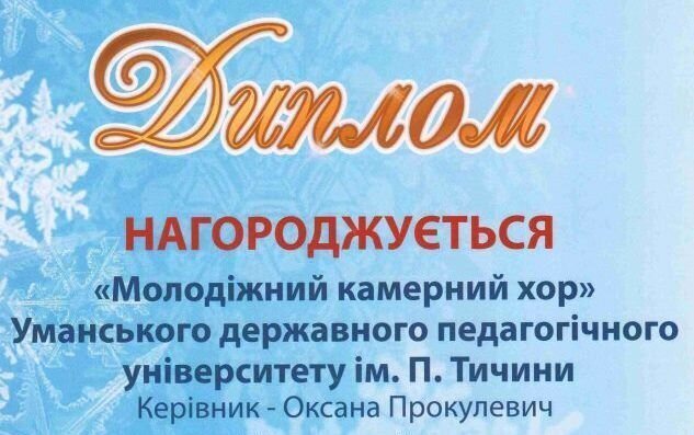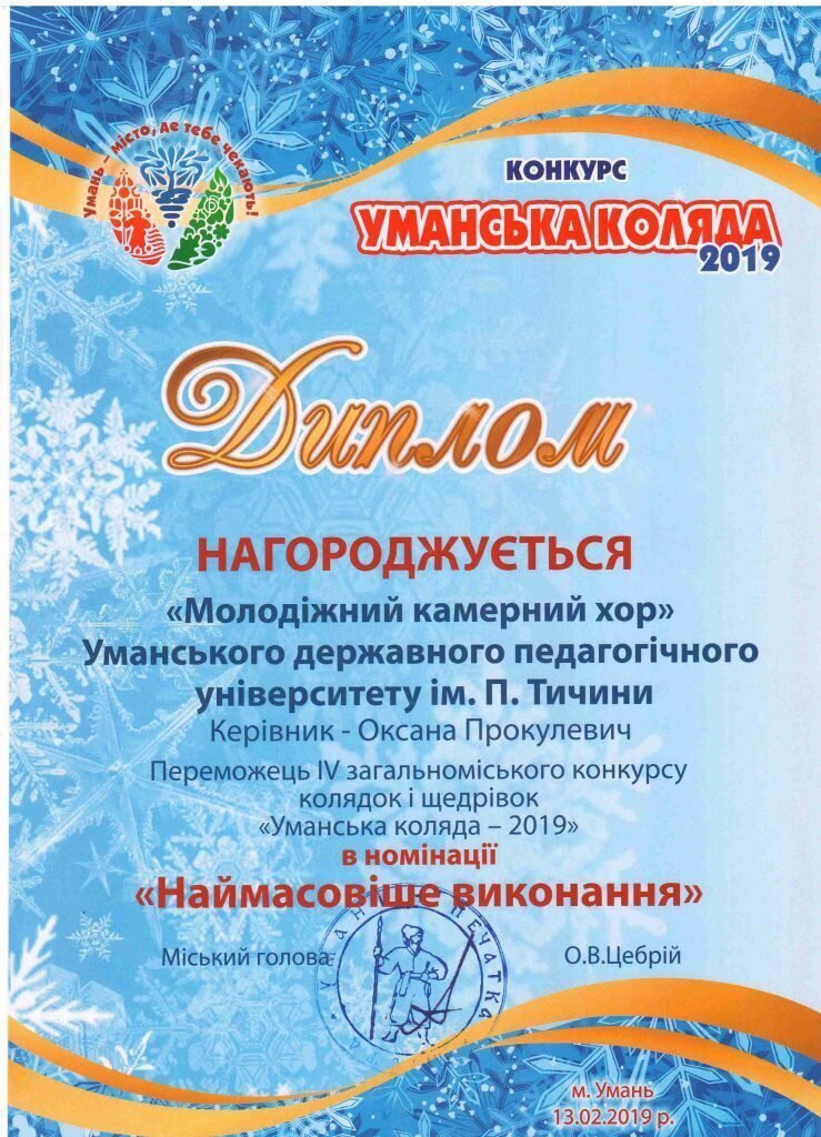 Нещодавно було підведено підсумки IV загальноміського конкурсу колядок та щедрівок «Уманська коляда – 2019». «Молодіжний камерний хор» факультету мистецтв Уманського державного педагогічного університету імені Павла Тичини (художній керівник та диригент – Оксана Прокулевич) став переможцем в номінації «Наймасовіше виконання». Колектив виконав твір Ігоря Поклада в аранжуванні Віктора Заволгіна – «Коляда».