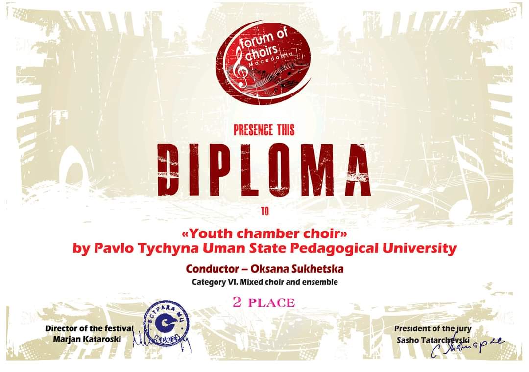 «Молодіжний камерний хор» (художній керівник та дириґент – Оксана Сухецька) факультету мистецтв Уманського державного педагогічного університету імені Павла Тичини став Лауреатом ІІ ступеня Міжнародного Різдвяного хорового форуму-фестивалю в Македонії!