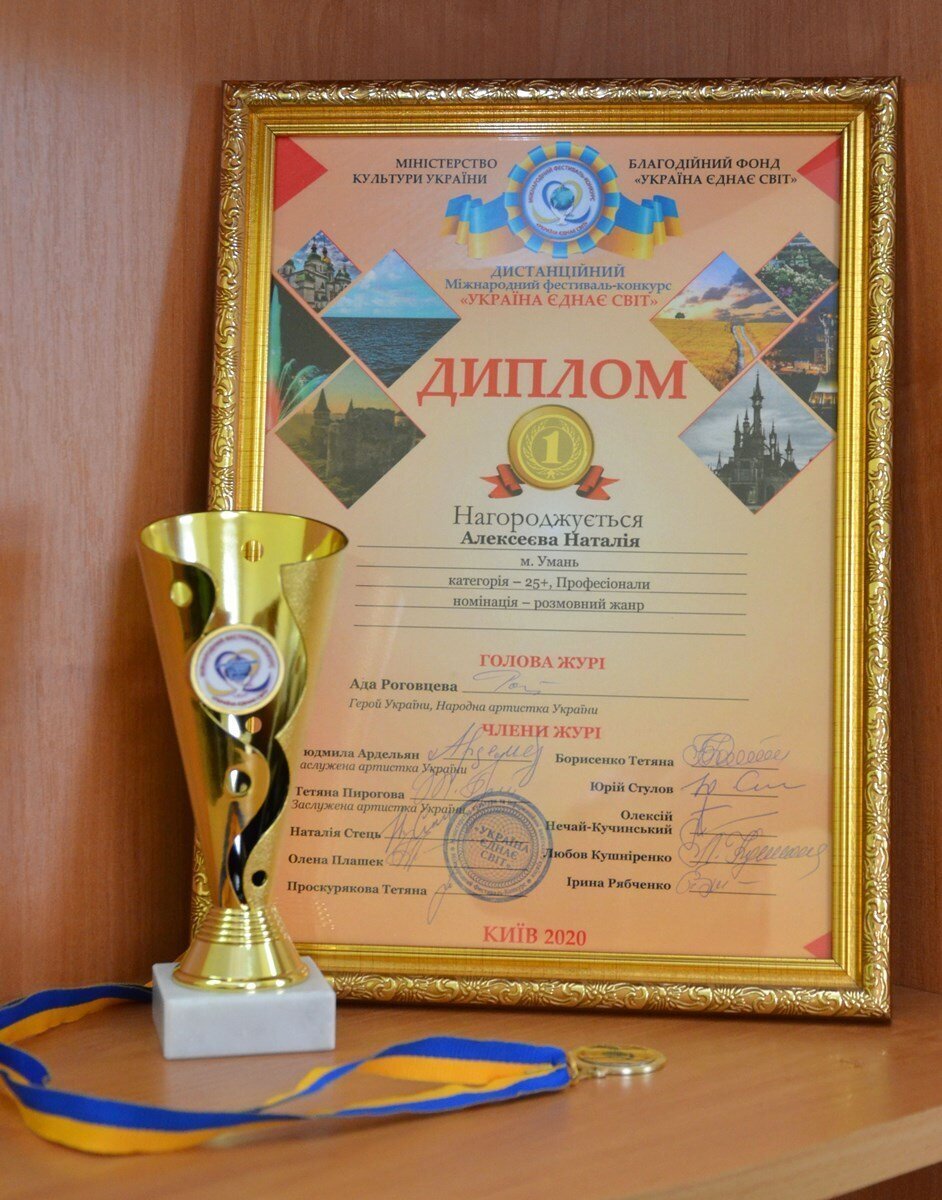 Заслужений працівник культури України, художній керівник, режисер-постановник народного студентського театру драми і комедії Уманського державного педагогічного університету імені Павла Тичини Наталія Алексеєва отримала диплом І ступеня у номінації «Розмовний жанр» (категорія «Професіонали 25+») за участь у дистанційному Міжнародному фестивалі-конкурсі «Україна єднає світ» Ця перемога вкотре стала підтвердженням її майстерності та професіоналізму. Конкурс проходив за підтримки Міністерства культури України та благодійного фонду «Україна єднає світ». Конкурсантів оцінювало високопрофесійне журі на чолі з Народною артисткою України Адою Роговцевою.