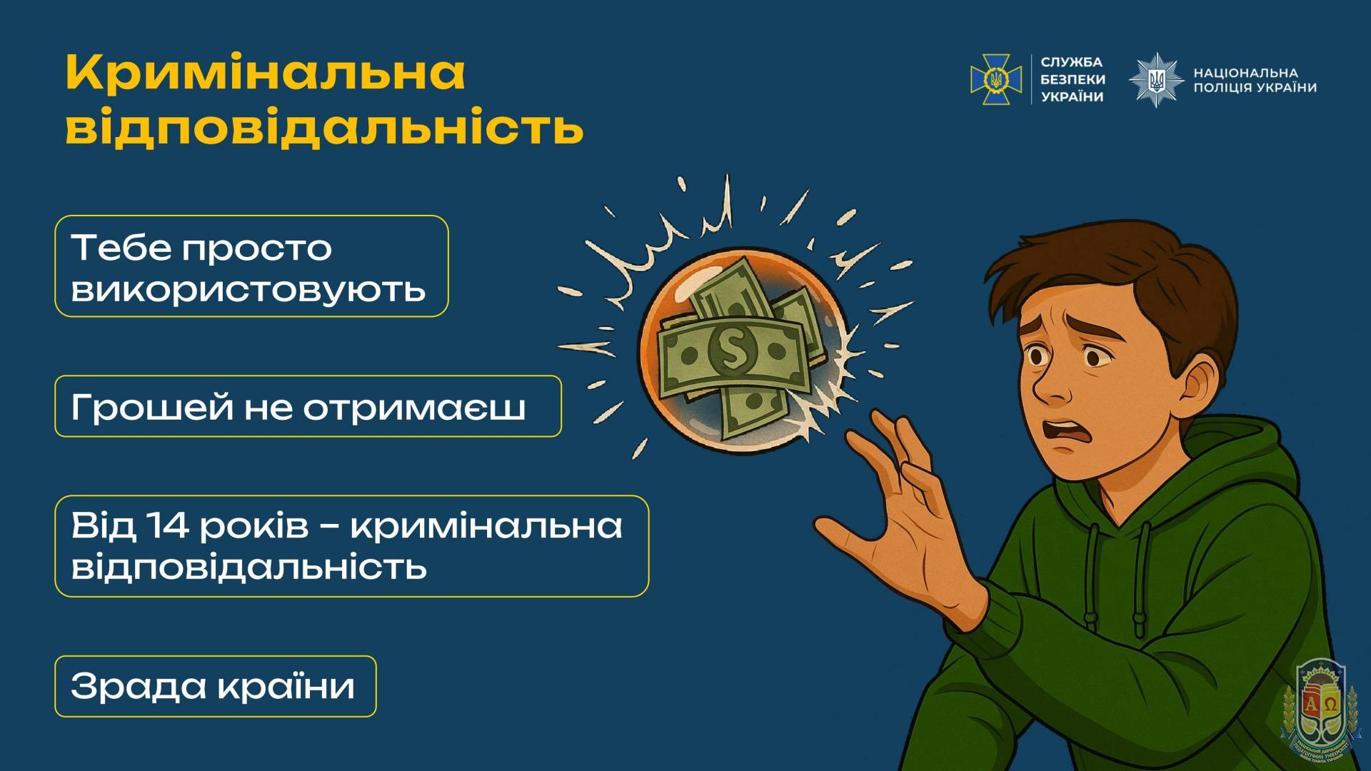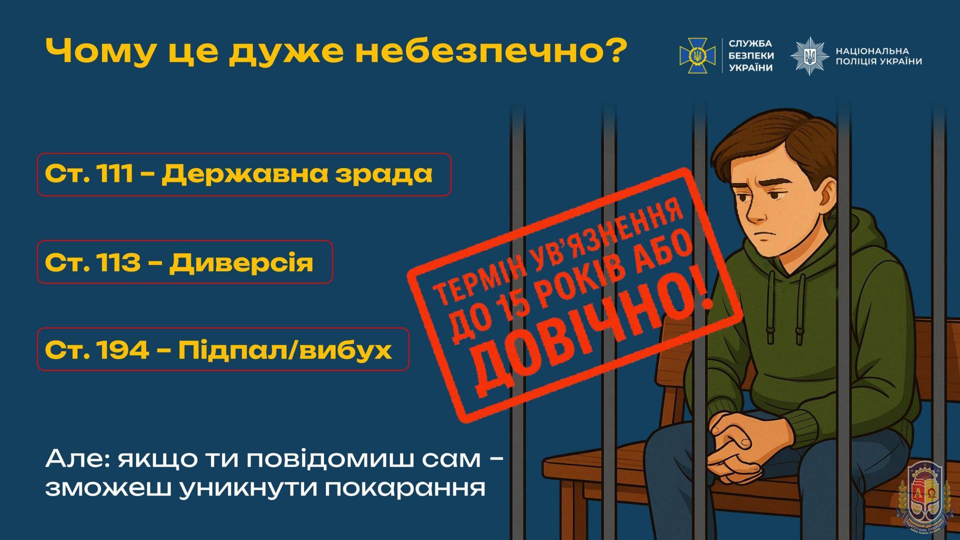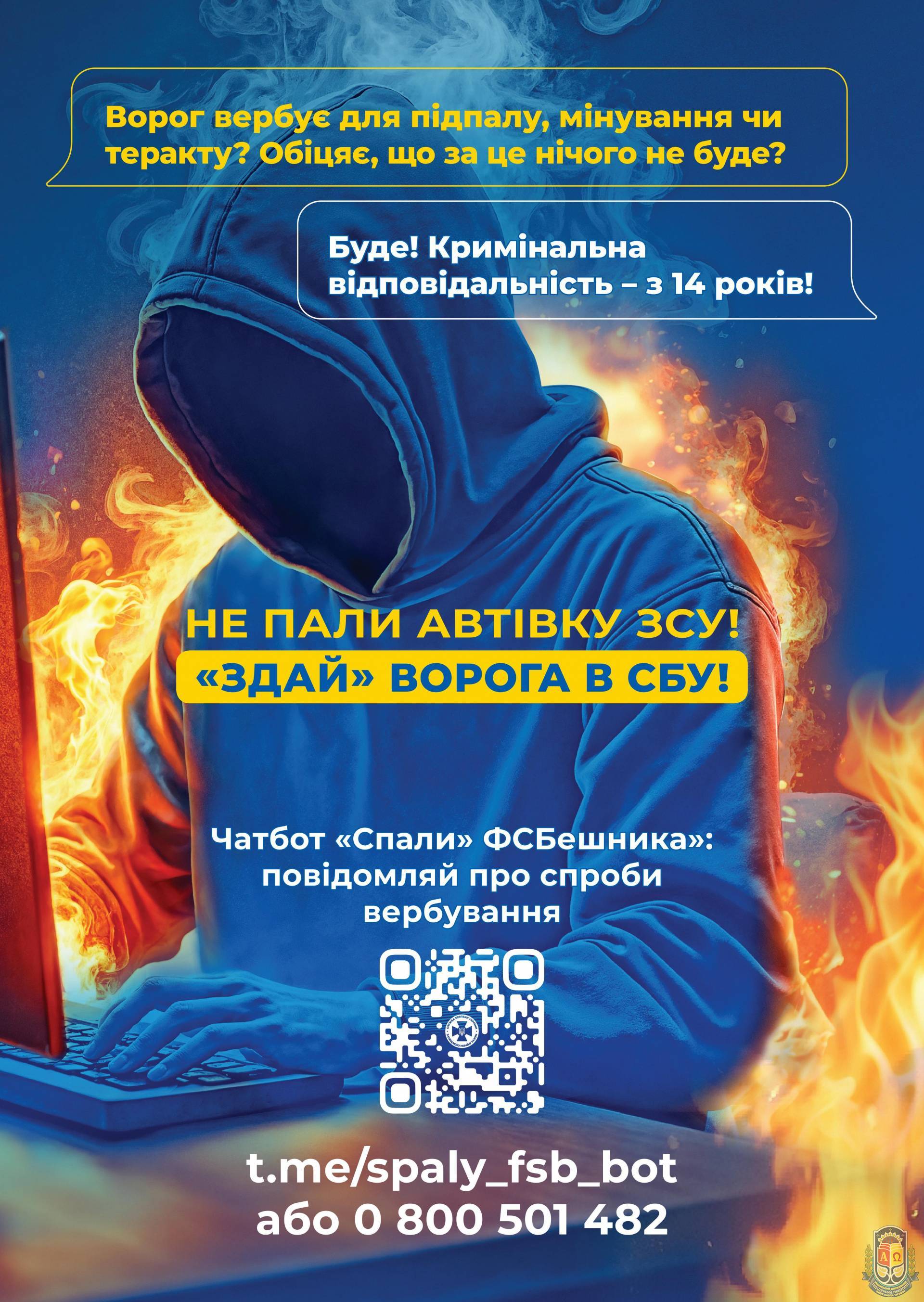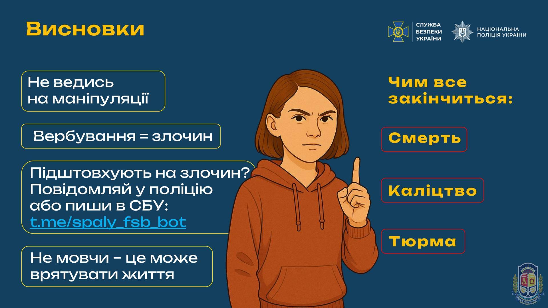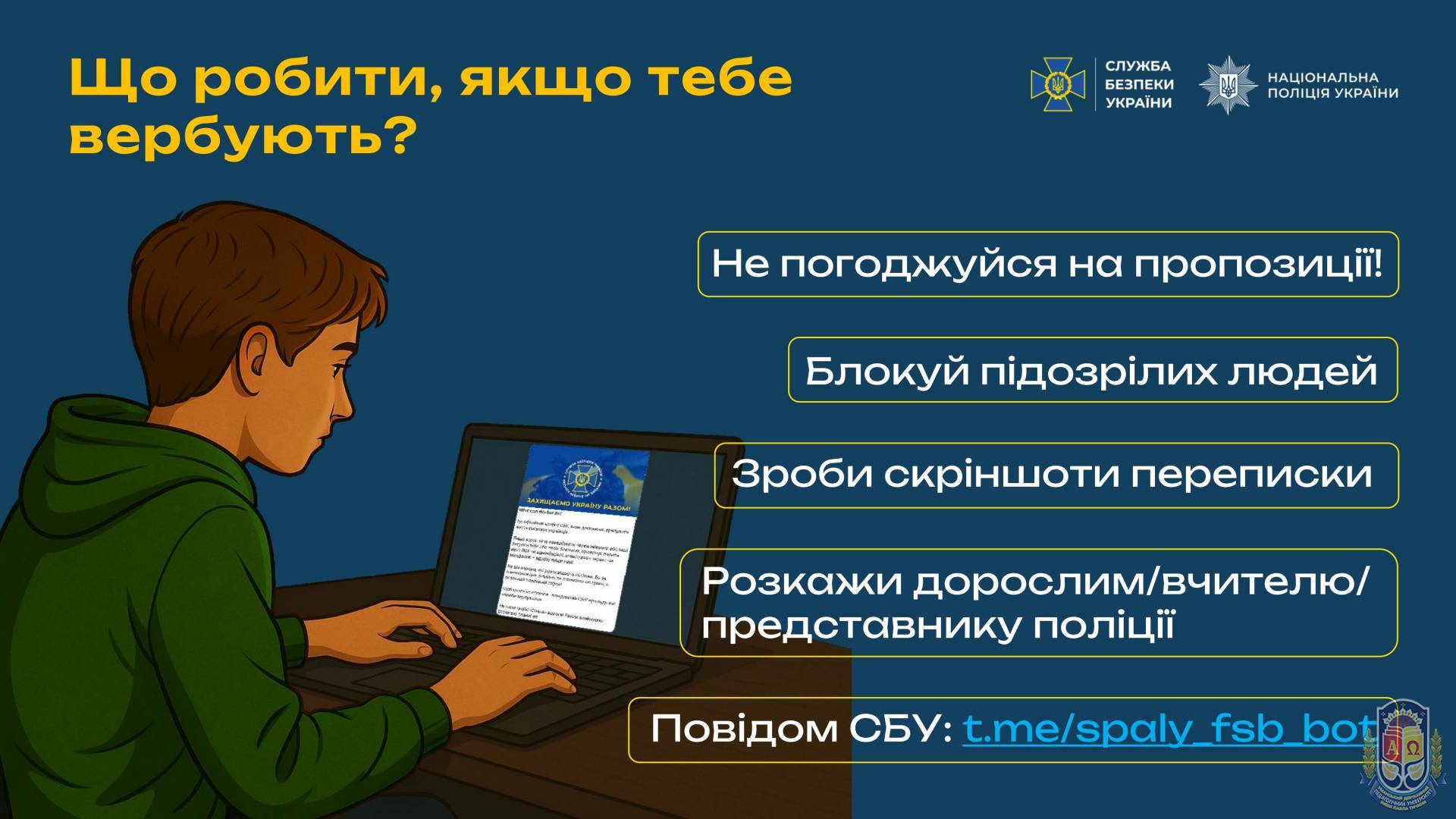 Нагадуємо, що у разі отримання пропозиції від росіян вчинити протиправні дії, необхідно передати дані у спеціальний чат-бот Служби безпеки України «Спали» ФСБшника» (t.me/spaly_fsb_bot), зателефонувати на гарячі лінії Національної поліції України або повідомити ювенального інспектора (офіцера безпеки) закладу освіти.