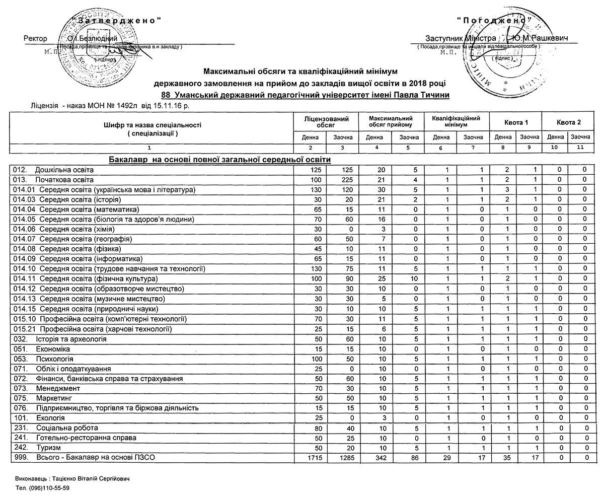 Уманський державний педагогічний університет отримав погоджені Міністерством освіти і науки України максимальні обсяги та кваліфікаційні мінімуми державного замовлення на 2018 рік (набір на базі повної загальної середньої освіти для здобуття ОКР «Бакалавр»).