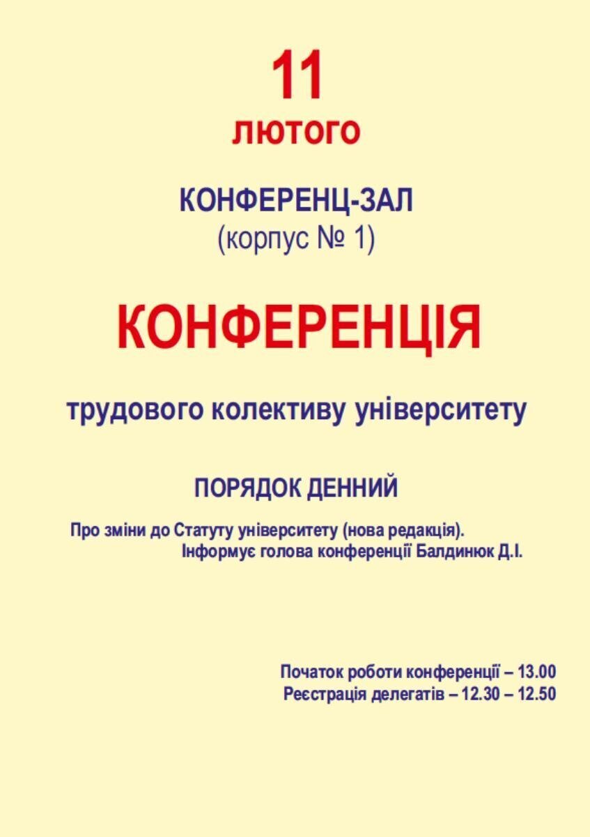 11 лютого 2020 року відбудеться конференція трудового колективу університету з порядком денним: