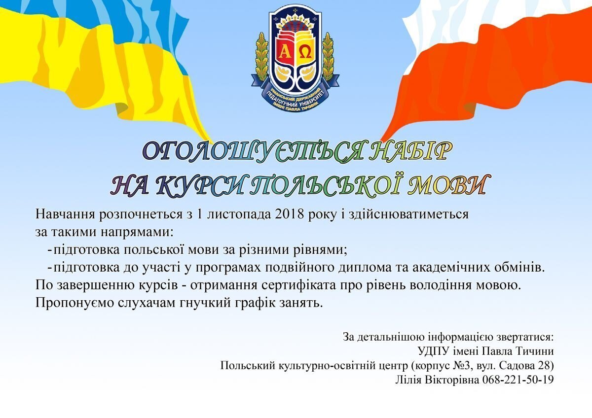 ОГОЛОШУЄТЬСЯ НАБІР НА КУРСИ ПОЛЬСЬКОЇ МОВИ