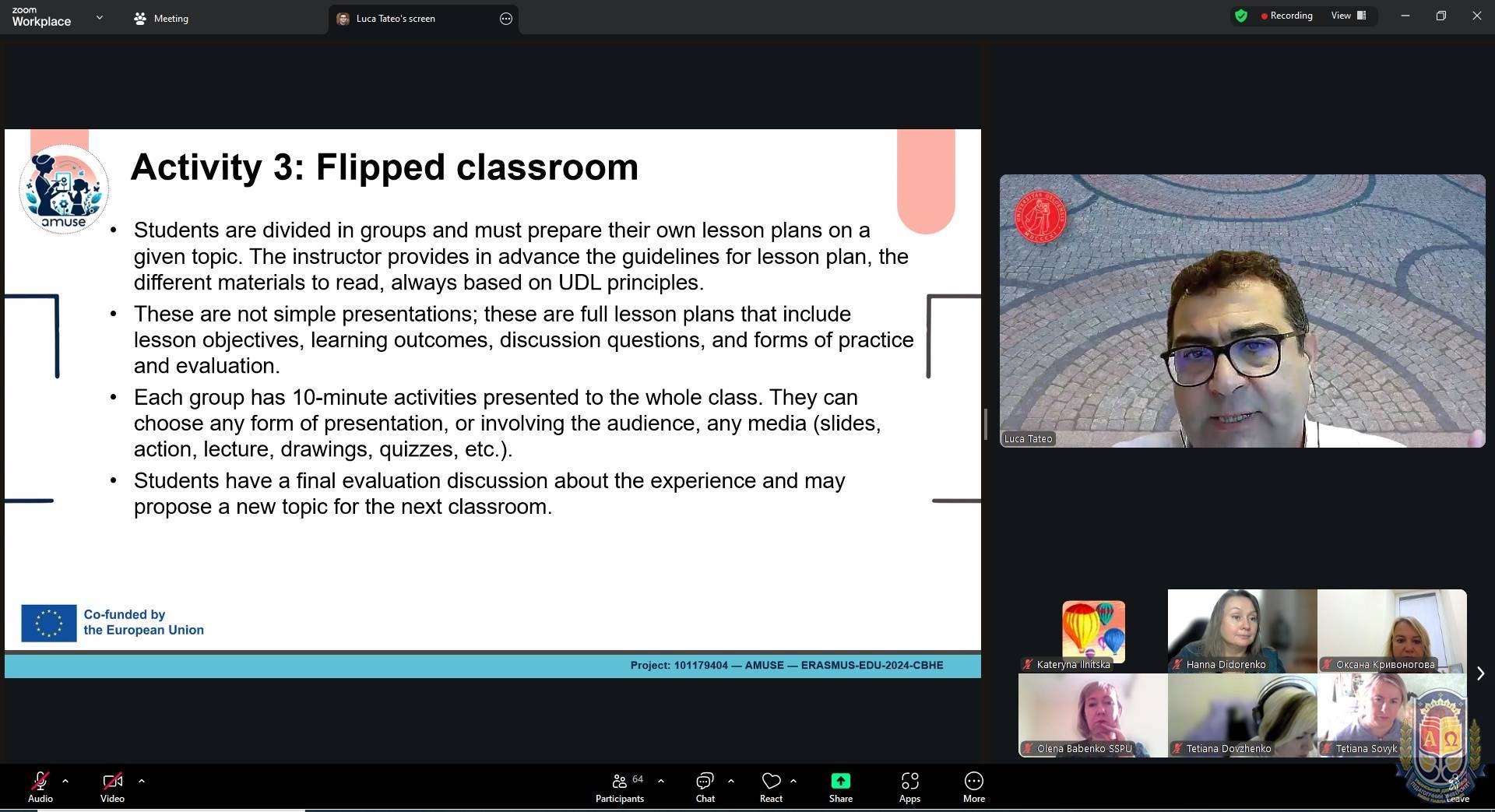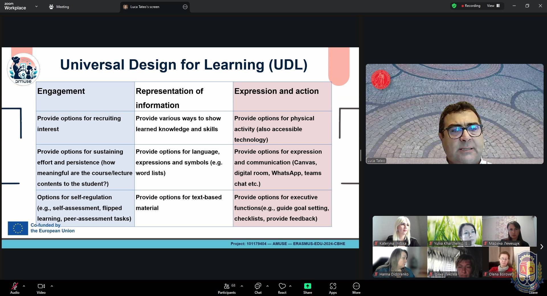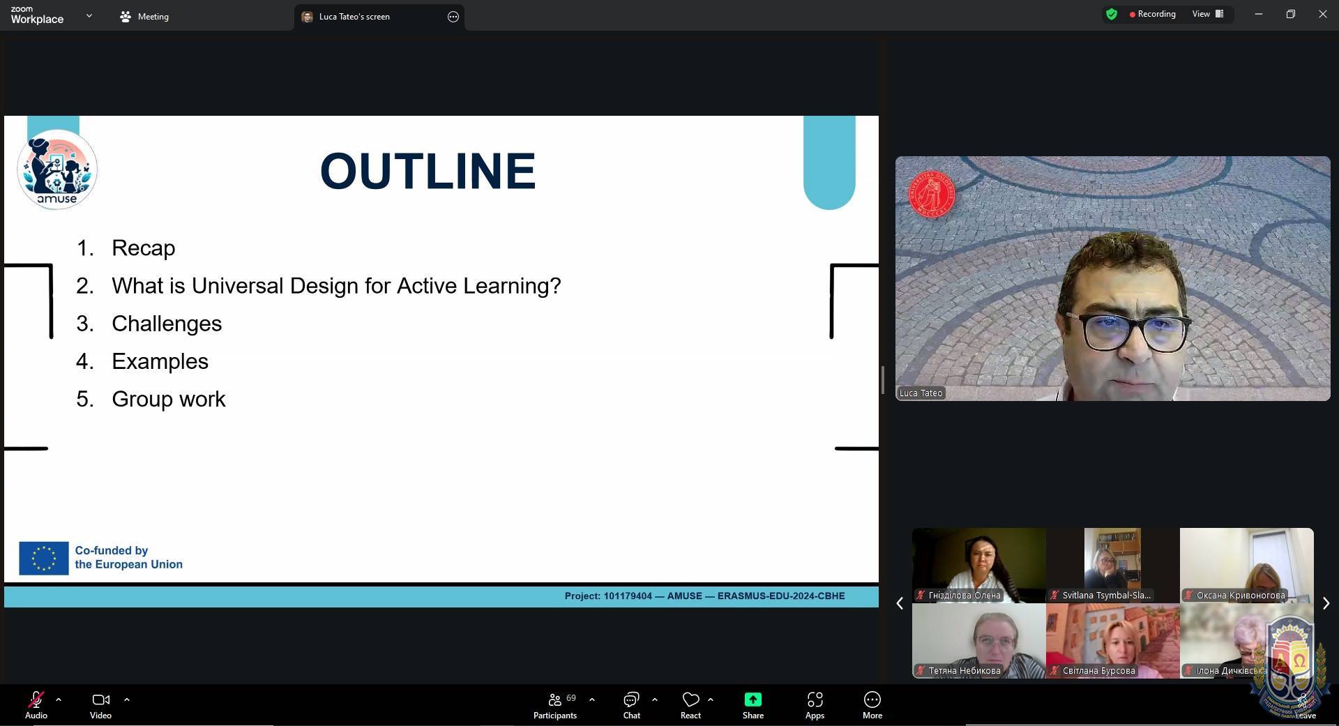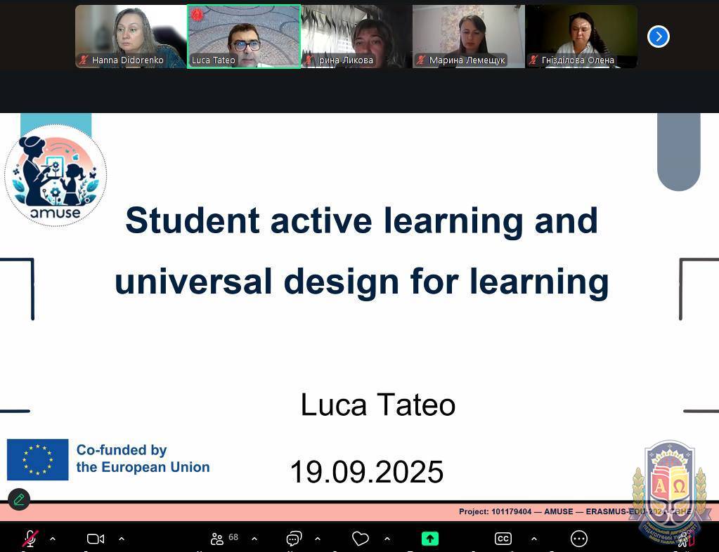 Учасники вебінару ознайомилися з концепцією Універсального дизайну активного навчання (UDAL), яка поєднує принципи UDL із методами активного навчання для створення гнучких та захопливих освітніх середовищ. Професор Татео також відзначив основні виклики для викладачів, серед яких: розробка доступних матеріалів, поєднання інституційних вимог із індивідуальними потребами студентів та надання їм більшої автономії.