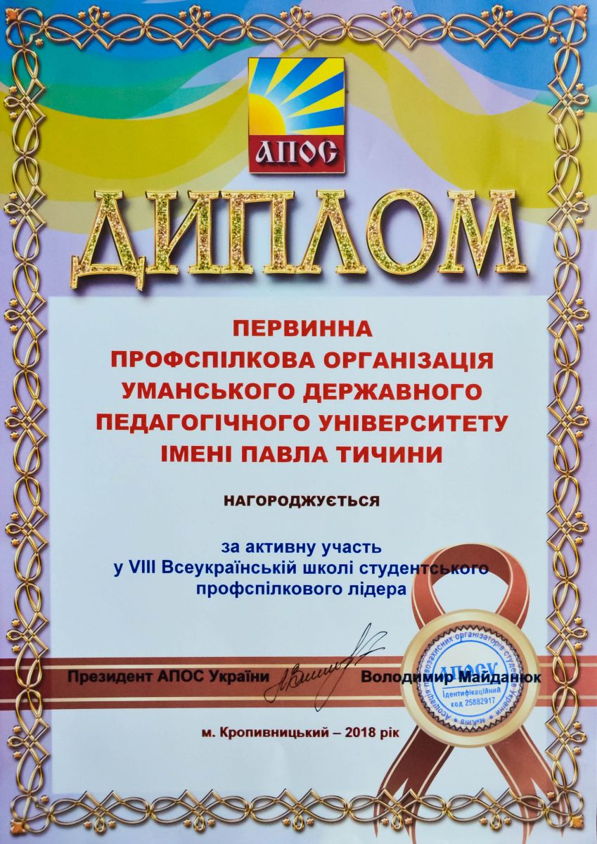 Первинну профспілкову організацію Уманського державного педагогічного університету імені Павла Тичини (голова Валентин Хитрук) нагороджено дипломом за участь у VIII Всеукраїнській школі студентського профспілкового лідера.