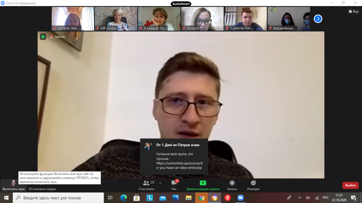 Представники Молодіжного центру «Start» факультету соціальної та психологічної освіти Уманського державного педагогічного університету імені Павла Тичини взяли участь у онлайн-майстерні щодо оновлення навчальної програми «Ефективний менеджмент молодіжних центрів». Модератори заходу – Департамент молодіжної політики Міністерства молоді та спорту та ГО «Молодіжна платформа».
