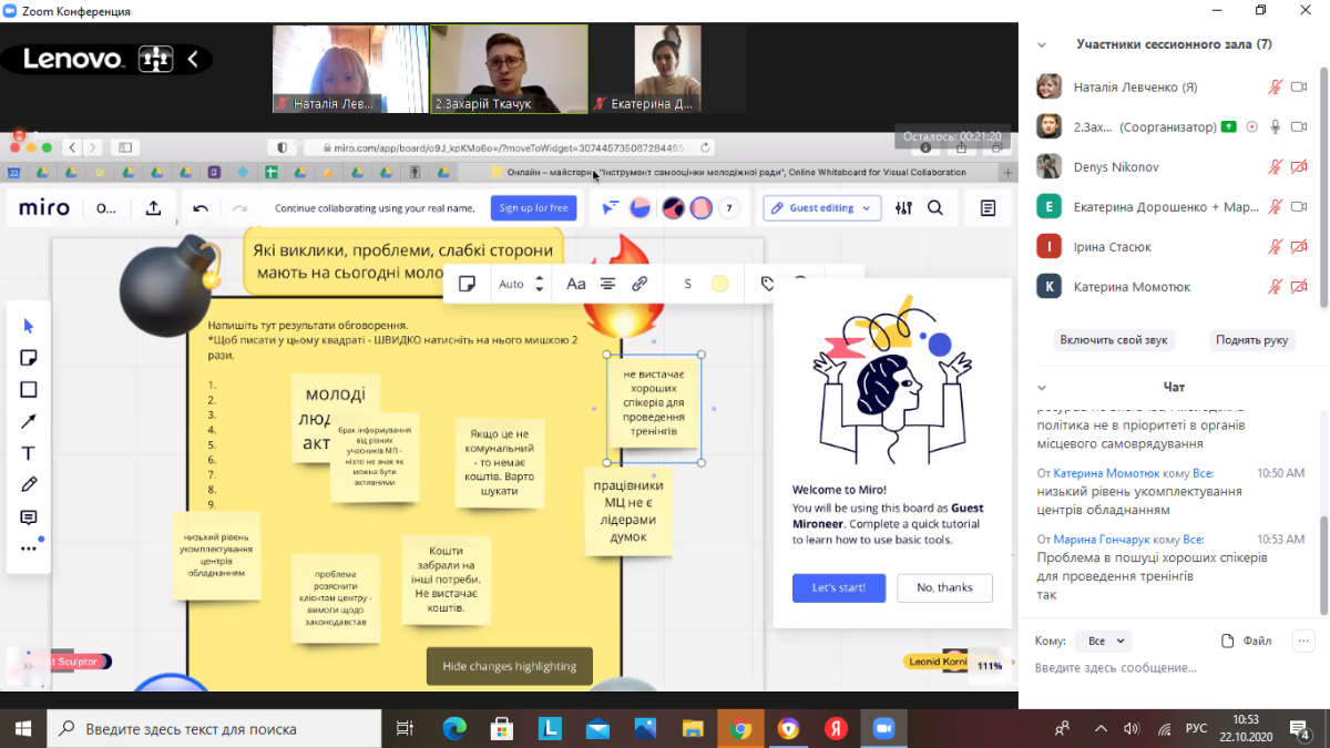 Враховуючи сучасний суспільний запит до ефективної роботи молодіжних центрів, учасники обговорили чотири блоки актуальних питань: виклики, проблеми та слабкі сторони, які на сьогодні мають молодіжні центри; теми, які мають бути включені у навчання представників молодіжних центрів; особливості онлайн навчання молодіжних центрів; діяльність молодіжних центрів на локальному, регіональному та національному рівнів.