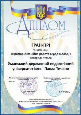 2012рік – Гран-прі в номінаціях: «Кращий дизайн офіційного сайту вищого навчального закладу», «Профорієнтаційна робота серед молоді»; почесне звання «Лідер національної освіти»;