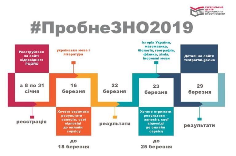 08 січня 2019 року з 09:00 розпочалася реєстрація на пробне ЗНО, яка завершиться 31 січня 2019 року о 18:00. Для реєстрації вступнику необхідно мати при собі паспорт або свідоцтво про народження.