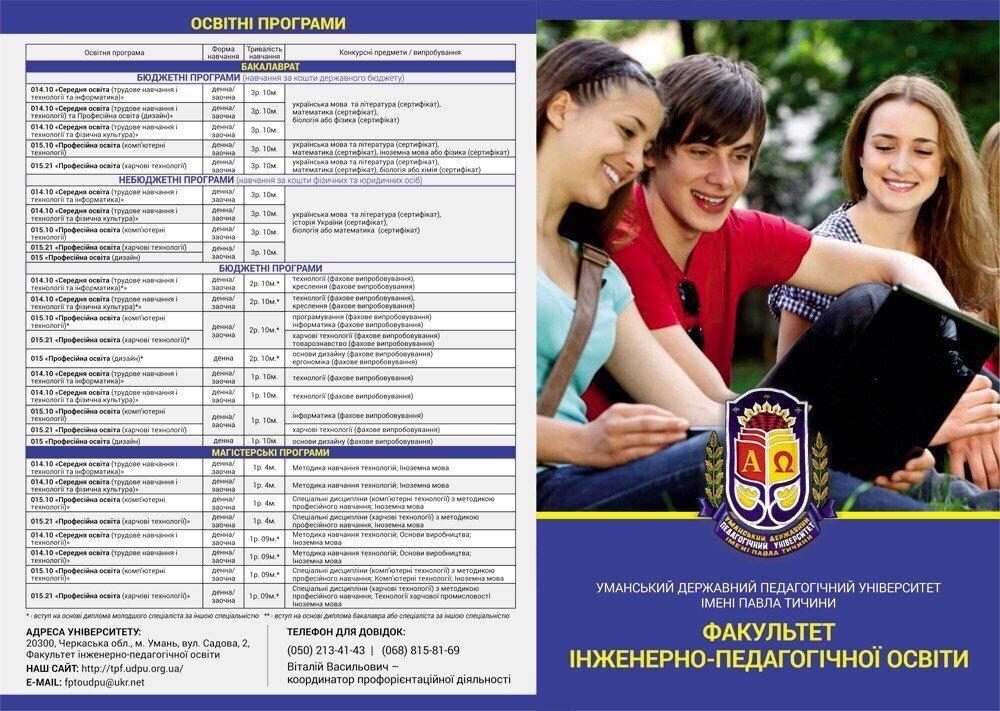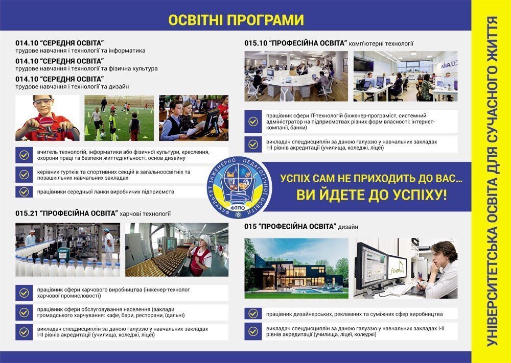 Факультет інженерно-педагогічної освіти УДПУ імені Павла Тичини особливим чином вирізняється з-поміж інших тим, що здійснює підготовку за інженерно-технологічними та професійно-орієнтованими освітніми програми, які дадуть можливість майбутнім випускникам і престижно працевлаштуватися, і достойно заробляти, і, що не менш важливо, одержати насолоду від постійного творчого розвитку та самовдосконалення.