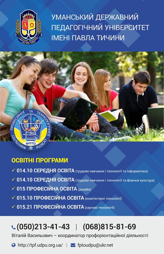 Факультет професійної та технологічної освіти УДПУ імені Павла Тичини особливим чином вирізняється з-поміж інших тим, що здійснює підготовку за інженерно-технологічними та професійно-орієнтованими освітніми програми, які дадуть можливість майбутнім працівникам і престижно працевлаштуватися, і достойно заробляти, і, що не менш важливо, одержати насолоду від постійного творчого розвитку та самовдосконалення.