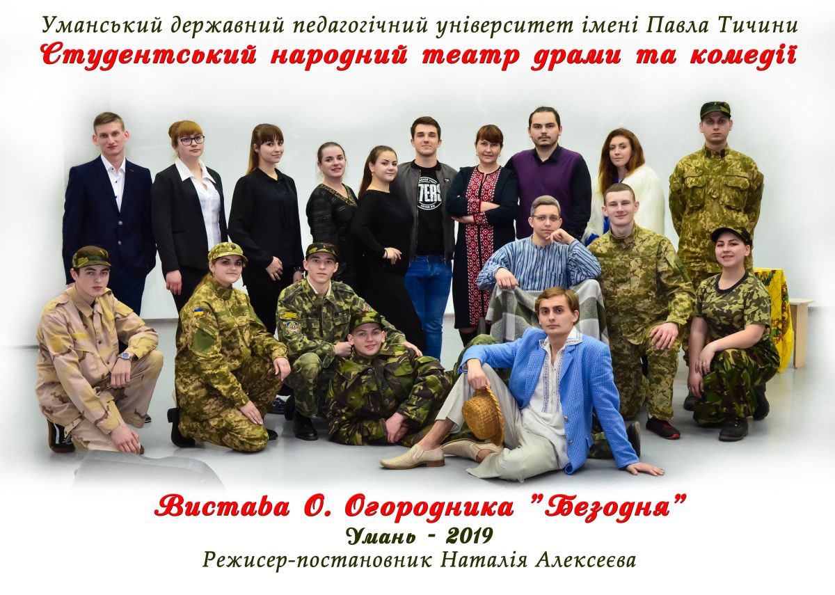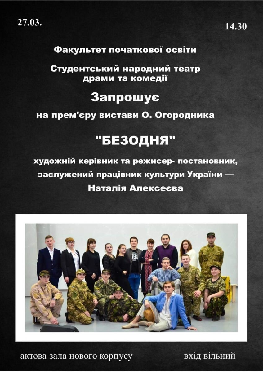 Студентський театр драми і комедії факультету початкової освіти Уманського державного педагогічного університету імені Павла Тичини та режисер-постановник Наталія Алексеєва запрошують на прем’єру вистави Ореста Огородника «Безодня». Чекаємо на вас в актовій залі нового корпусу вул. Садова,28 0 14.30 годині. Вхід вільний.