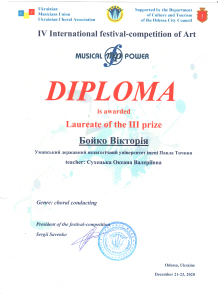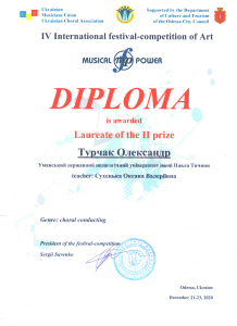 Студенти факультету мистецтв Уманського державного педагогічного університету імені Павла Тичини стали Лауреатами VI Міжнародного фестивалю-конкурсу мистецтв «Musical Power» у номінації: «Диригентське мистецтво». Цього року, зважаючи на світову пандемію COVID-19, фестиваль відбувся у дистанційному режимі.