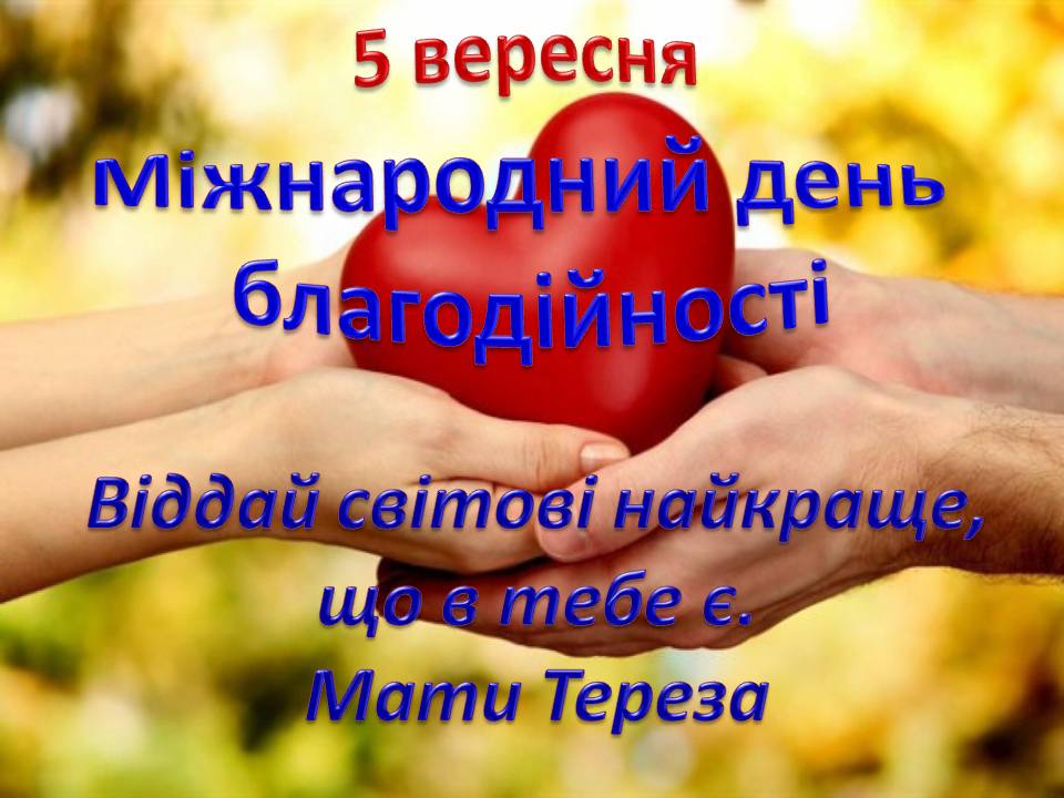 5 вересня відзначається Міжнародний день благодійності. Метою свята є привернути увагу до проблем людей, пов’язаних із бідністю та гуманітарними кризами. ООН хоче нагадати про важливість благодійності та волонтерської діяльності. Пропозицію організувати таке свято зробила Угорщина. Саме 5 вересня померла Мати Тереза – відома місіонерка та католицька черниця.