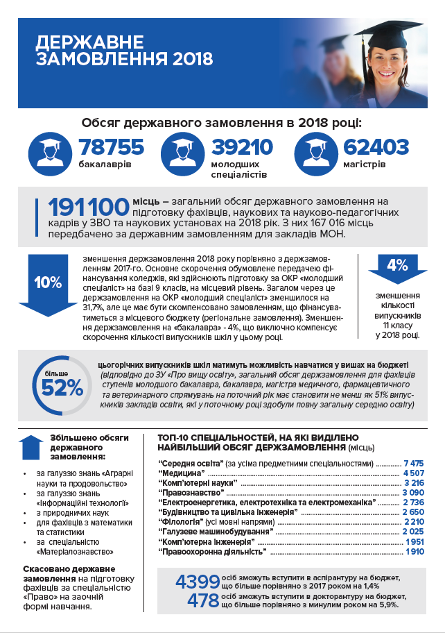 Зменшення держзамовлення на підготовку фахівців (на 9,6 %) переважно пов’язано з тим, що цього року фінансування коледжів передано на місцеві бюджети та скоротилась кількість випускників 11 класів. Однак загалом більше 52% цьогорічних випускників шкіл матимуть можливість навчатися у вишах за державний кошт.