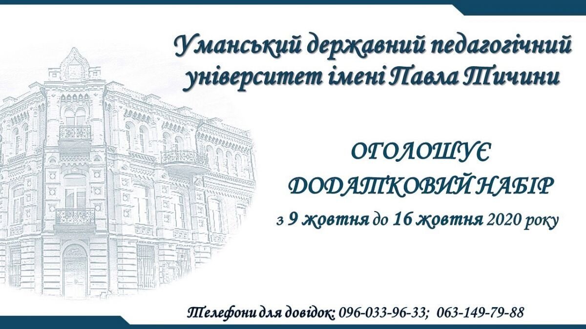 До уваги вступників! Уманський державний педагогічний університет оголошує додатковий набір за освітніми ступенями «Молодший бакалавр», «Бакалавр» (заочна форма навчання) та «Магістр» (денна та заочна форми навчання) на місця за кошти фізичних та/або юридичних осіб.