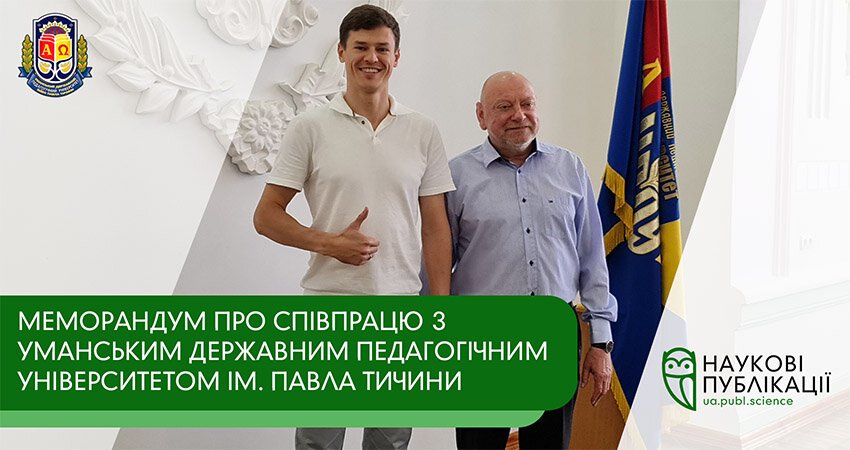 Уманський державний педагогічний університет імені Павла Тичини та компанія «Наукові публікації» («Scientific Publications») підписали Меморандум про співробітництво у сфері освіти, науки, наукометрії і наукових досліджень, який передбачає активну співпрацю та допомогу закладу зі сторони компанії у збільшенні кількості та якості наукових публікацій і їхнього розміщення у Міжнародних наукометричних базах даних.
