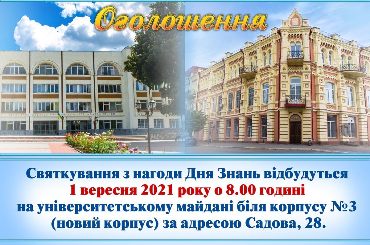 Святкування проходитимуть 1 вересня 2021 року о 8.00 годині на університетському майдані біля корпусу №3(новий корпус) за адресою Садова, 28.
