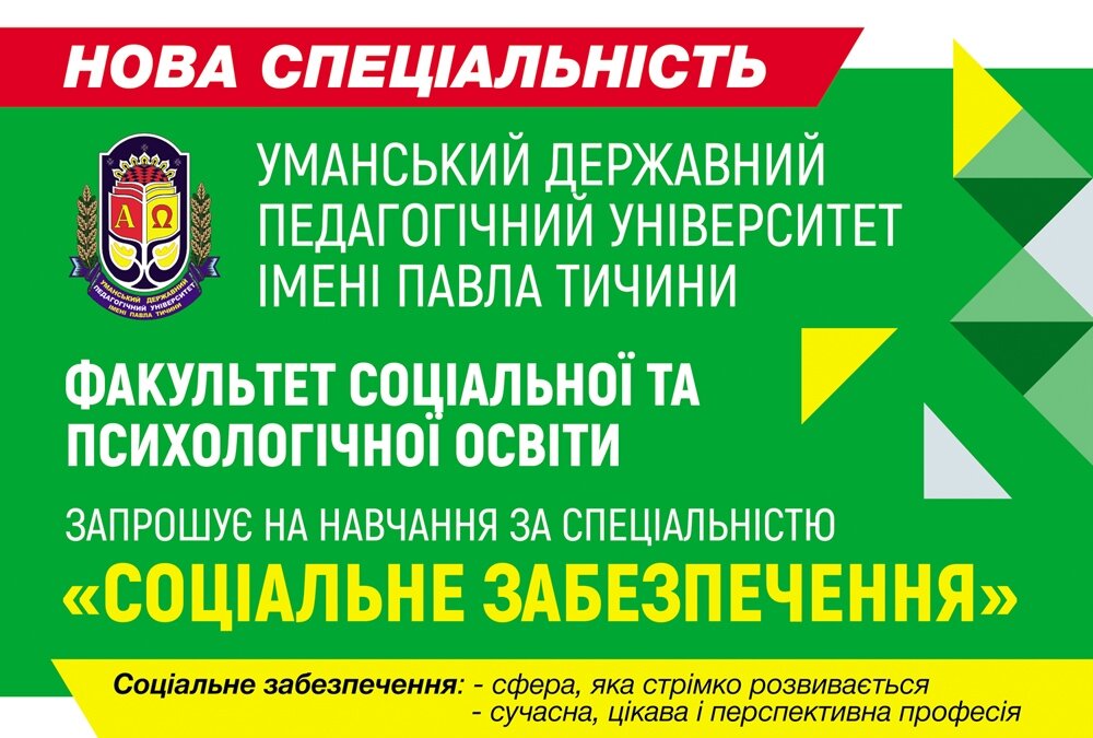 В Уманському державному педагогічному університеті імені Павла Тичини відкрито нову спеціальність 126 «Соціальне забезпечення». Підготовка фахівців буде здійснюватися на базі факультету соціальної та психологічної освіти.
