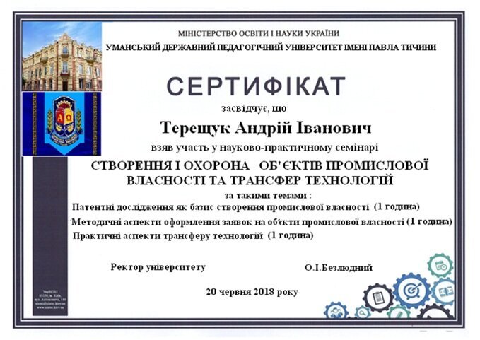 На початку семінару виступив завідувач кафедри технологічної освіти, професор Андрій Терещук. Він наголосив, що потреба у проведенні семінару виникла у зв’язку із зростаючим зацікавленням Міністерства освіти і науки України у сучасних інноваційних розробках та впровадженні їх у виробництво. Така робота в УДПУ імені Павла Тичини активно проводиться: щороку наш заклад отримує більше 10 патентів на винаходи та корисні моделі і, як правило, декілька патентів впроваджується у виробництво, тобто забезпечується трансфер технологій. Одним із лідерів такої діяльності по створенню об'єктів промислової власності та трансферу технологій є доцент кафедри технологічної освіти Олег Мелентьєв, йому і була доручена організація та проведення семінару.