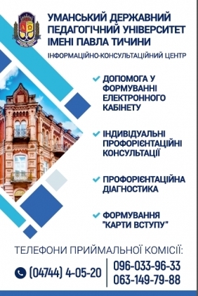 Шановні вступники! З 1 липня 2019 року розпочинає роботу інформаційно-консультаційний центр Уманського державного педагогічного університету імені Павла Тичини. Фахівці центру допомагають абітурієнтам створити електронний кабінет, відсканувати і завантажити необхідні документи та сформувати «карту вступу», надають детальні консультації щодо особливостей вступної кампанії 2019 року, проводять профорієнтаційну діагностику, інформують про освітні програми і спеціальності, за якими можна здобути вищу освіту в університеті.