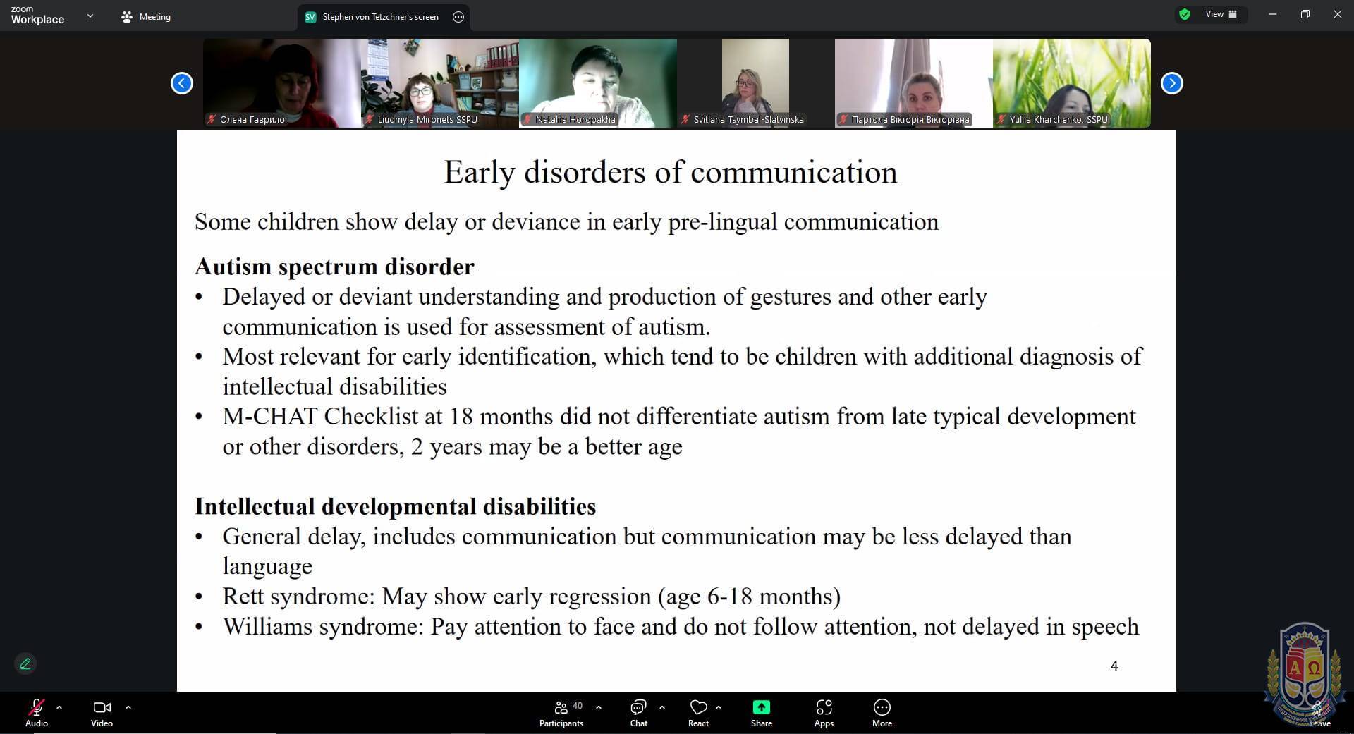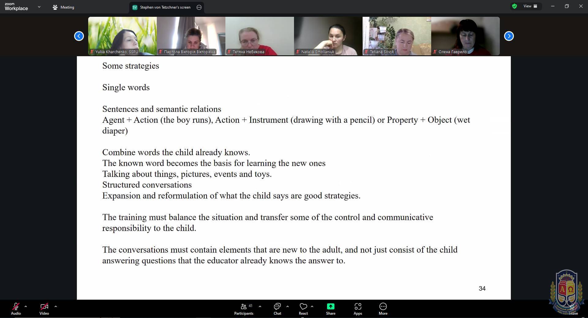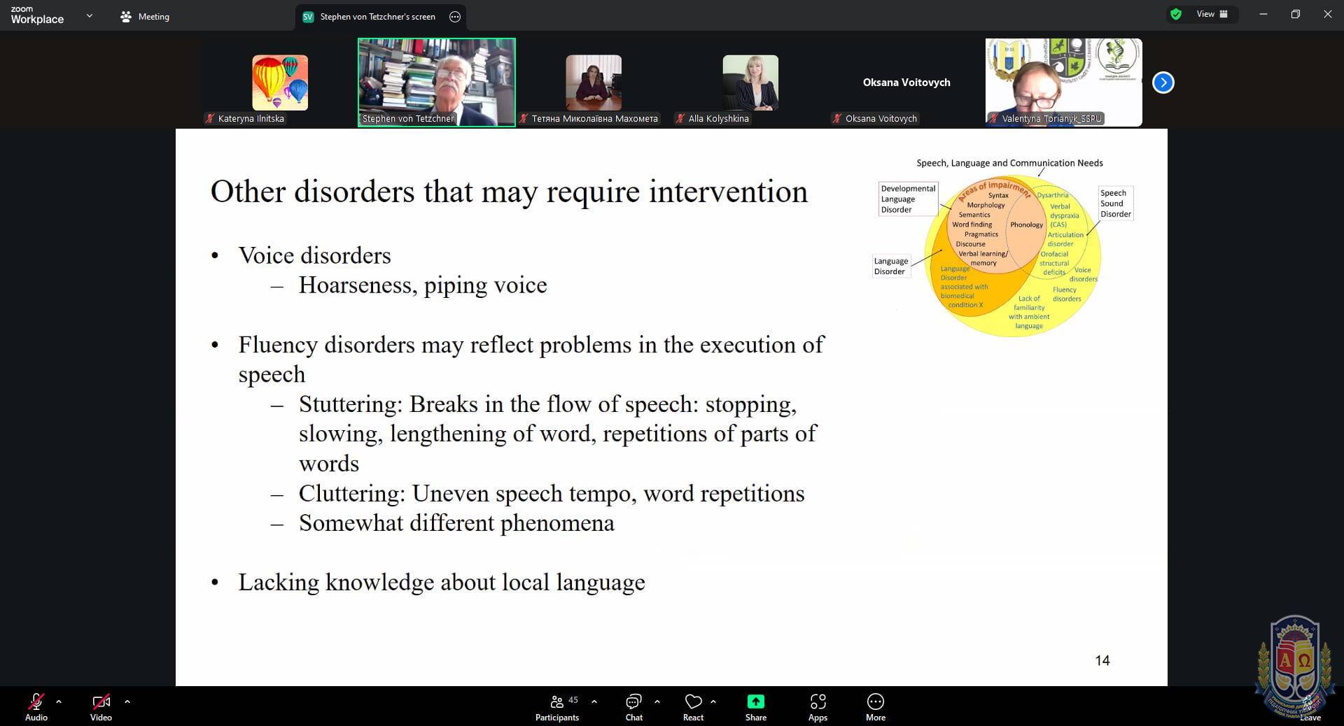 Prof. Stephen von Tetzchner навів статистичні дані, згідно з якими близько 10% дітей на початку шкільного навчання мають ті чи інші труднощі з мовленням, і в частини з них проблеми можуть зберігатися навіть у підлітковому віці. Особливу увагу спікер приділив методам стимуляції мовного розвитку, зокрема поєднанню відомих і нових слів у повсякденному спілкуванні, використанню структурованих розмов, а також розширенню та переформулюванню висловлювань дитини для активізації мовлення.
