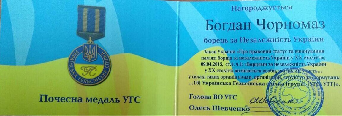 Вітаємо кандидата історичних наук, доцента кафедри історії Укараїни історичного факультету Уманського державного педагогічного університету імені Павла Тичини Богдана Чорномаза із почесним нагородою - "Борець за Незалежність України". Медаль Української гельсінської спілки була вручена Богдану Данловичу головою ВО УГС Олесем Шевченко з нагоди 30-ліття Української Гельсінської Спілки на науковій конференції «Історична роль Української Гельсінської спілки у відновленні незалежності Української держави (1988-1990 рр.)», яка відбулася наприкінці жовтня 2018 року в місті Київ.