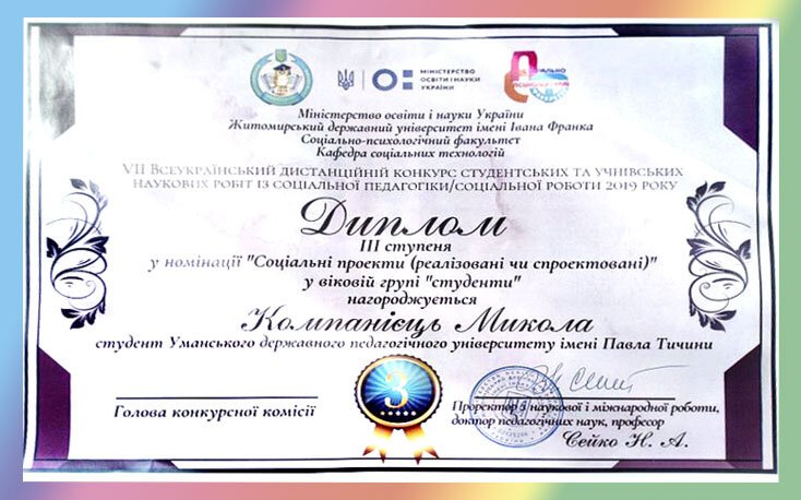 Вітаємо студента факультету соціальної та психологічної освіти Миколу Компанійця (наукові керівники: Оксана Кравченко, Алла Войтовська) із зайнятим ІІІ місцем у номінації соціальні проекти VII Всеукраїнського дистанційного конкурсу студентських та учнівських наукових робіт із соціальної педагогіки/соціальної роботи, який проводився Житомирським державним університетом імені Івана Франка.