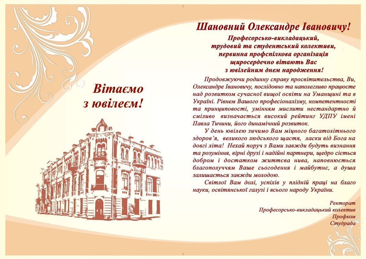 Продовжуючи родинну справу просвітительства, Ви, Олександре Івановичу, послідовно та наполегливо працюєте над розвитком сучасної вищої освіти на Уманщині та в Україні. Рівнем Вашого професіоналізму, компетентності та принциповості, умінням мислити нестандартно й сміливо визначається високий рейтинг УДПУ імені Павла Тичини, його динамічний розвиток.