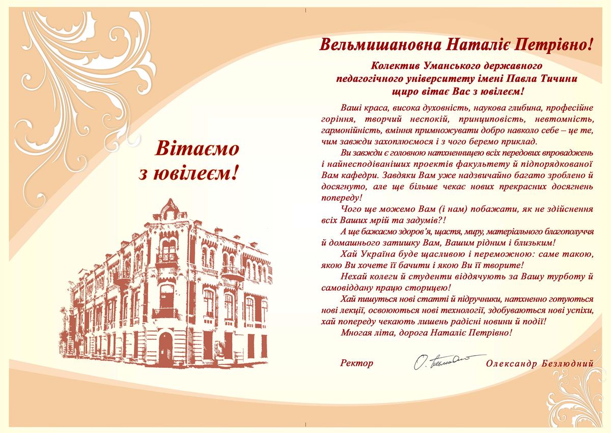 На початку лютого святкує свій ювілей шанована всіма людина, знаний педагог та наставник, кандидат педагогічних наук, професор, завідувач кафедри української літератури, українознавства та методики їх навчання Уманського державного педагогічного університету імені Павла Тичини Наталія Петрівна Сивачук. Найщиріші вітання з ювілеєм пані Наталії сьогодні адресує колектив університету.