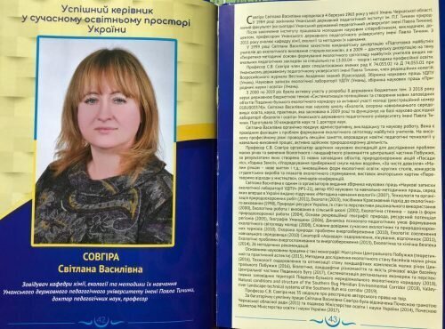 Науковці Уманського державного педагогічного університету імені Павла Тичини, зокрема, завідувач кафедри хімії, екології та методики їх навчання, доктор педагогічних наук, професор Світлана Совгіра та завідувач кафедри фахових методик та інноваційних технологій у початковій школі, доктор педагогічних наук, професор Ольга Комар увійшли до інформаційно-іміджевого видання «Успішні керівники в сучасному освітньому просторі України».