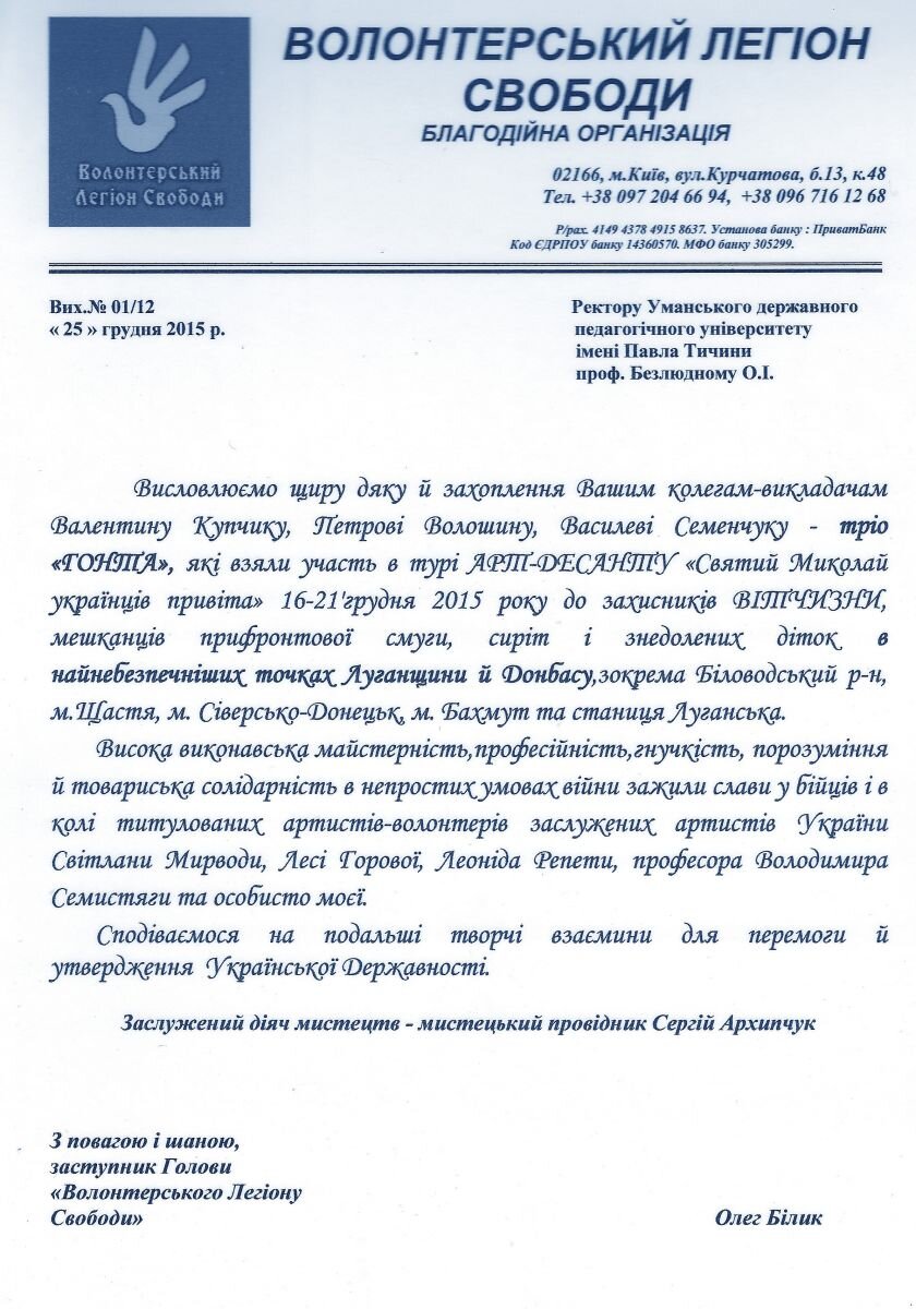 Нещодавно прийшло кілька таких листів-признань. У одному із них – від столичної благодійної організації «Волонтерський Легіон Свободи», що надійшов на ім’я ректора, професора Олександра Безлюдного говориться: «Висловлюємо захоплення й щиру дяку Вашим колегам-викладачам Валентину Купчику, Петрові Волошину, Василеві Семенчуку – учасникам тріо «Гонта», які взяли участь в турі Арт-десанту «Святий Миколай українців привітай» в найнебезпечніші точки Луганщини й Донбасу, зокрема, Біловодський район, міста Щастя, Сіверськодонецьк, м. Бахмут та станицю Луганська до захисників Вітчизни, мешканців прифронтової смуги, сиріт і знедолених, діток. Їх Висока виконавська майстерність тріо «Гонта», професійність, гнучкість, порозуміння й товариська солідарність в непростих умовах війни зажили слави у бійців та в колі титулованих артистів-волонтерів заслужених артистів України Світлани Мирводи, Лесі Горової, Леоніда Репети, професора Володимира Семистяги. Сподіваємося на подальші творчі взаємини для перемоги й утвердження Української державності. З повагою і шаною, заслужений діяч мистецтв - мистецький провідник Сергій Архипчук, заступник Голови Волонтерського Легіону Свободи» Олег Білик.