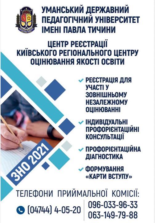 Офіційний центр реєстрації КРЦОЯО Уманського державного педагогічного університету імені Павла Тичини інформує, що з 1 лютого до 5 березня триватиме реєстрація для участі у ЗНО 2021. Адміністрації закладів освіти зможуть зареєструвати учнів (слухачів, студентів) для проходження ДПА у формі ЗНО до 1 березня 2021 року.