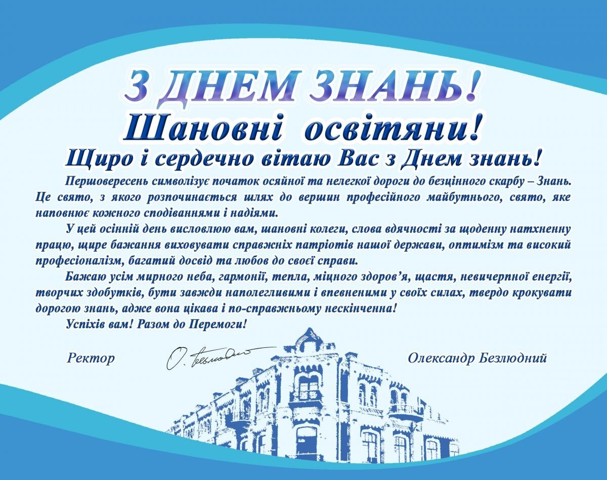 У цей осінній день висловлюю вам, шановні колеги, слова вдячності за щоденну натхненну працю, щире бажання виховувати справжніх патріотів нашої держави, оптимізм та високий професіоналізм, багатий досвід та любов до своєї справи.