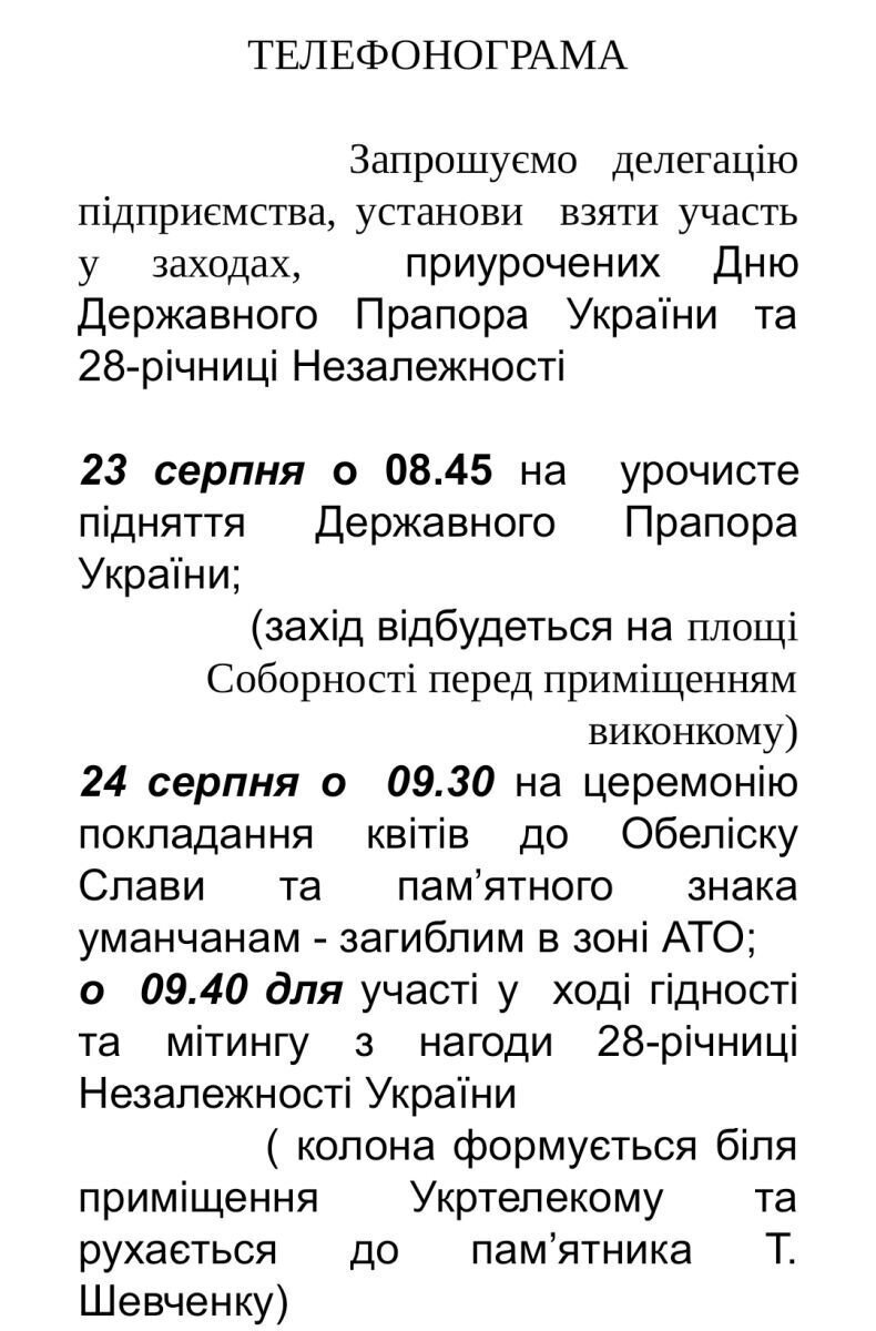 Шановні викладачі, студенти та співробітники УДПУ! Запрошуємо взяти участь у святкових заходах з нагоди 28-ї річниці незалежності України та Дня державного прапора України.