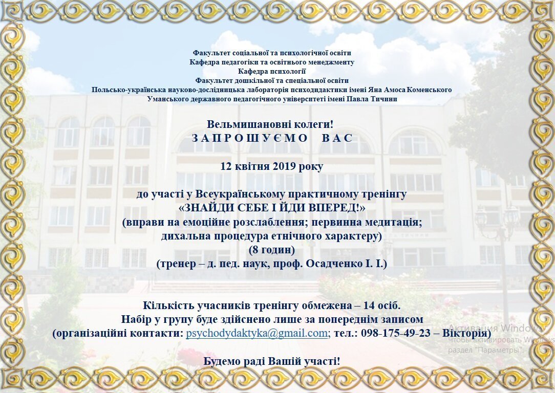 Запрошуємо 12 квітня 2019 року до участі у всеукраїнському практичному тренінгу «Знайди себе і йди вперед!». Набір у групу здійснюється за попереднім записом. Будемо раді вашій участі.