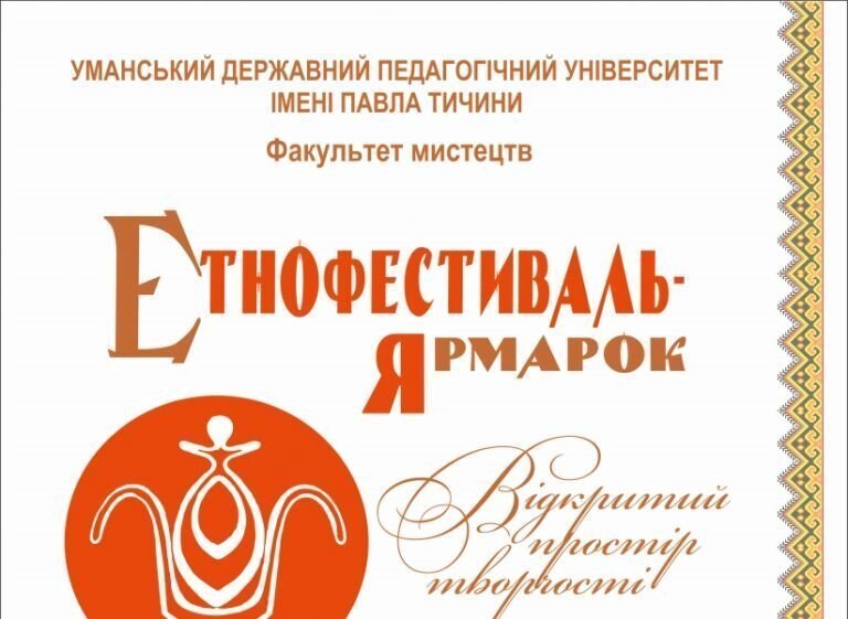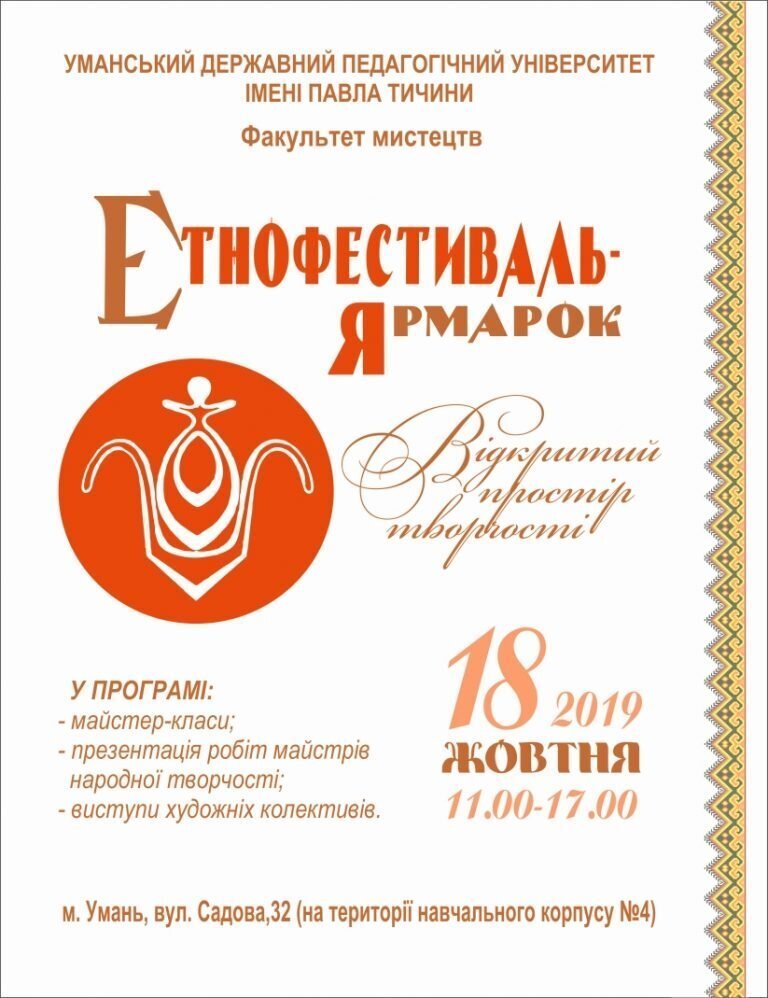 Уманський державний педагогічний університет імені Павла Тичини та факультет мистецтв запрошує професійні та аматорські творчі колективи (вокальні, інструментальні, хореографічні, фольклорні), майстрів декоративно-прикладного мистецтва взяти участь в Етнофестивалі-ярмарку «Відкритий простір творчості», який проходитиме 18 жовтня 2019 року.