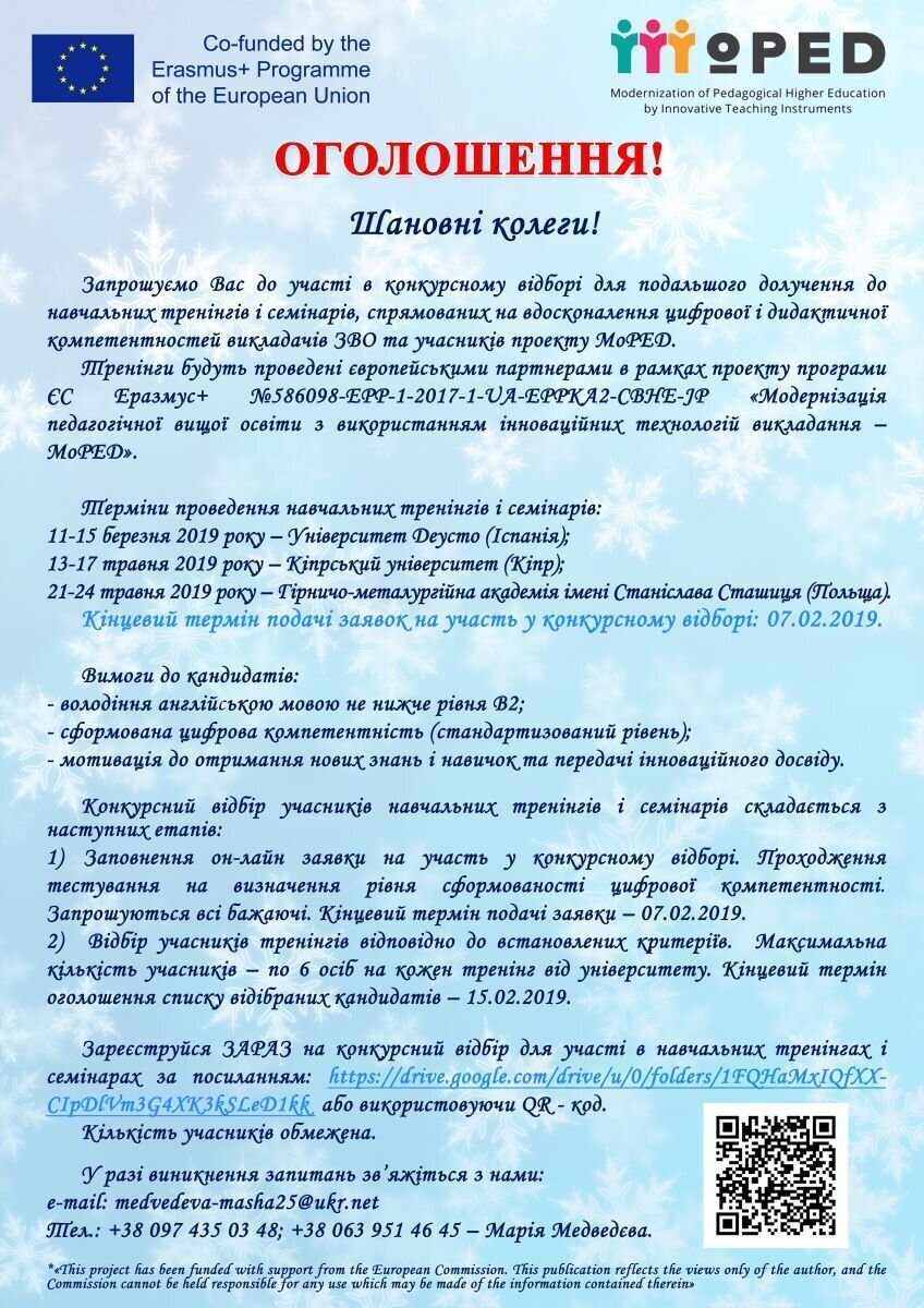 Запрошуємо Вас до участі в конкурсному відборі для подальшого долучення до навчальних тренінгів і семінарів, спрямованих на вдосконалення цифрової і дидактичної компетентностей викладачів ЗВО та учасників проекту MoPED. Тренінги будуть проведені європейськими партнерами в рамках проекту програми ЄС Еразмус+ № 586098-EPP-1-2017-1-UA-EPPKA2-CBHE-JP «Модернізація педагогічної вищої освіти з використанням інноваційних технологій викладання MoPED.