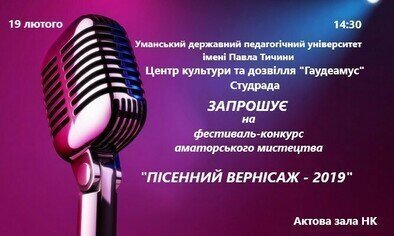 19 лютого 2019 року в Уманському державному педагогічному університеті імені Павла Тичини відбудеться фестиваль-конкурс патріотичної пісні «Пісенний вернісаж-2019». Запрошуємо до участі усіх бажаючих. Заявку на участь можна подати голові оргкомітету Наталії Алексеєвій (063 187 06 77).
