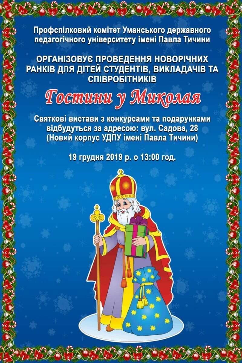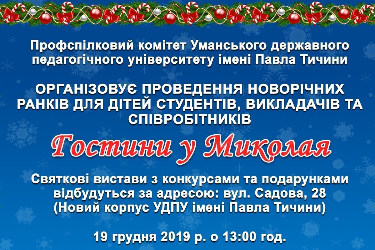 Профспілковий комітет Уманського державного педагогічного університету імені Павла Тичини запрошує на новорічні ранки дітей студентів, викладачів та співробітників. Святкові вистави з конкурсами та подарунками відбудуться 19 грудня о 13.00 годині 2019 року в актовій залі нового корпусу за адресою вул. Садова, 28.